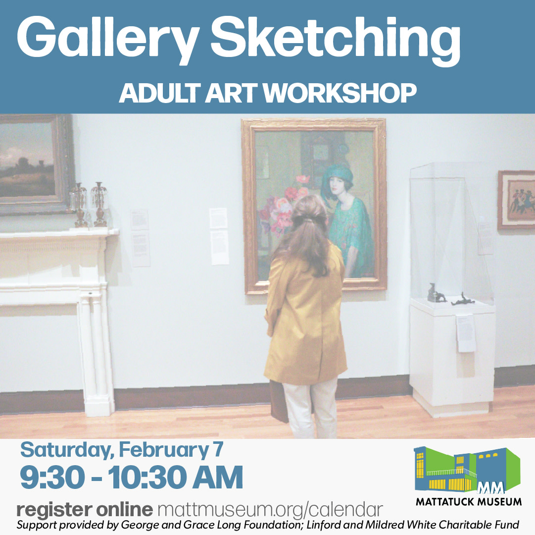 To the galleries we go! For this art class, join as we sketch our way around the galleries. All experience levels are welcome to take part in this practice. We will begin by warming up with quick sketches of art in the galleries, and spend the rest of the session working on a close-up study of an art piece of your choice. All materials will be provided.