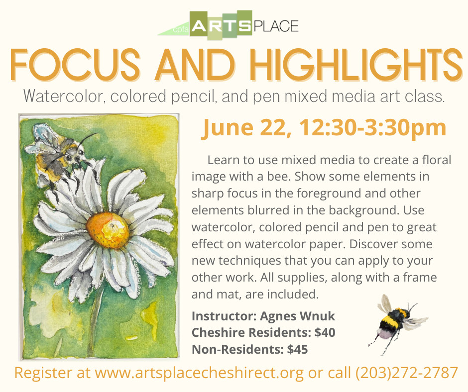 Learn to use mixed media to create a floral image with a bee. Show some elements in sharp focus in the foreground and other elements blurred in the background. Use watercolor, colored pencil and pen to great effect on watercolor paper. Discover some new techniques that you can apply to your other work. All supplies, along with a frame and mat, are included.