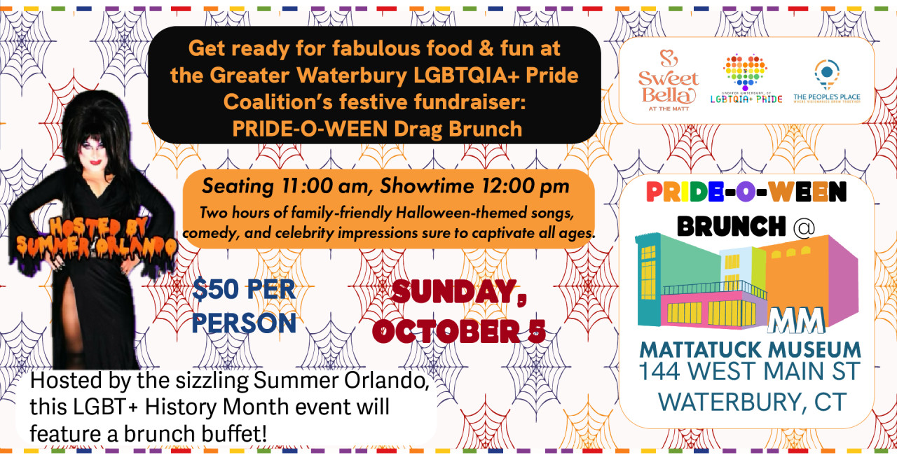 Celebrate LGBTQIA+ History Month at the Mattatuck Museum with Greater Waterbury LGBTQIA+ Pride Coalition’s festive fundraiser! Hosted by the sizzling Summer Orlando, this brunch buffet features two hours of family-friendly Halloween-themed songs, comedy, and celebrity impressions sure to captivate all ages.