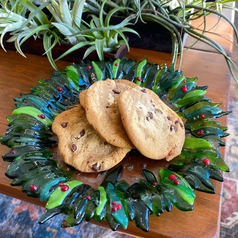Take home a beautiful + merry fused glass plate ready to showcase cookies and treats!