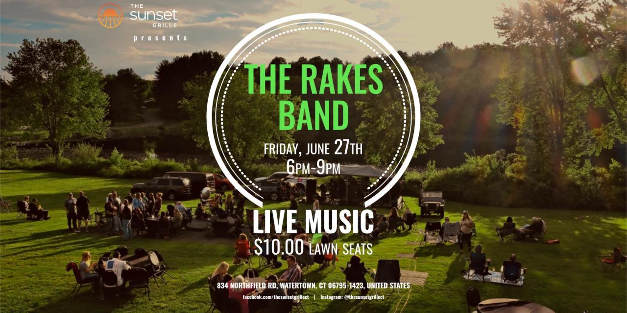 Get ready to sway and sing along with The Rakes Band at Sunset Grille! Enjoy live music as the sun sets and the lawn fills with the energy of summer. Grab your friends, set up your chairs, and soak in the sounds of this lively band!